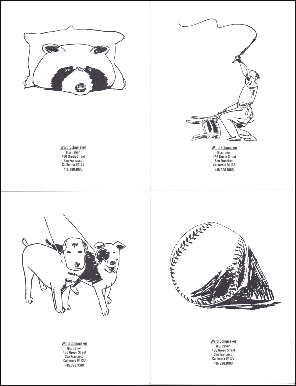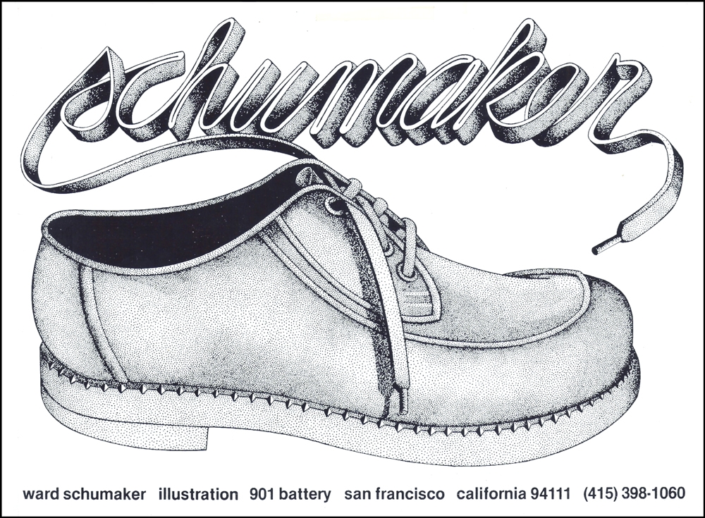 Note: Above is *my personal collection of Ward Schumaker’s early art styles (which I gathered and saved as I followed Ward’s successful entry into San Francisco’s graphic community. Some of these show their age and I have noted the years that they appeared in publications here in the San Francisco Bay region. The years show at the bottom of each image when they were published. (Self-promotions of the1970s and assignments from 1982 to 2008.)